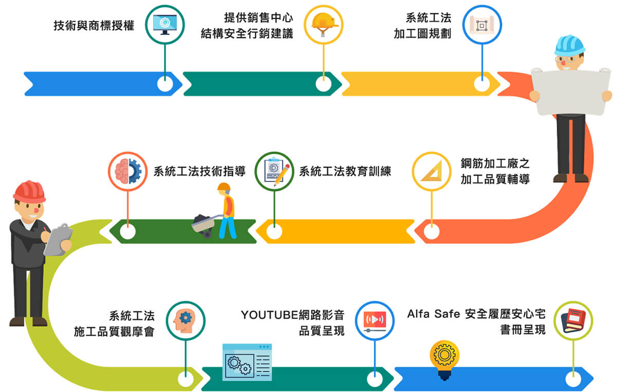 「Alfa Safe耐震」提供一條龍技術服務,採用工業化、系統化施工方式,針對建築物中每一個會裂、會漏水及地震容易破壞的每個地方,如同迴紋針般以一根鋼筋連續彎折無斷點一體成形,並將結構鋼筋設計與可執行的施工方式相互比對並確認,來解決鋼筋的加工綁紮與組裝問題,使結構設計者與施工人員對施工品質的標準達成共識,不僅讓工地工人容易施工、降低人力需求改善缺工問題、自動化的技術可確保施工品質、同時避免人為疏忽和工人素質參差不齊的困擾,更可將建築內部看不到的品質透明化呈現,全面提升住宅居住安全,耐震抗裂更有感!