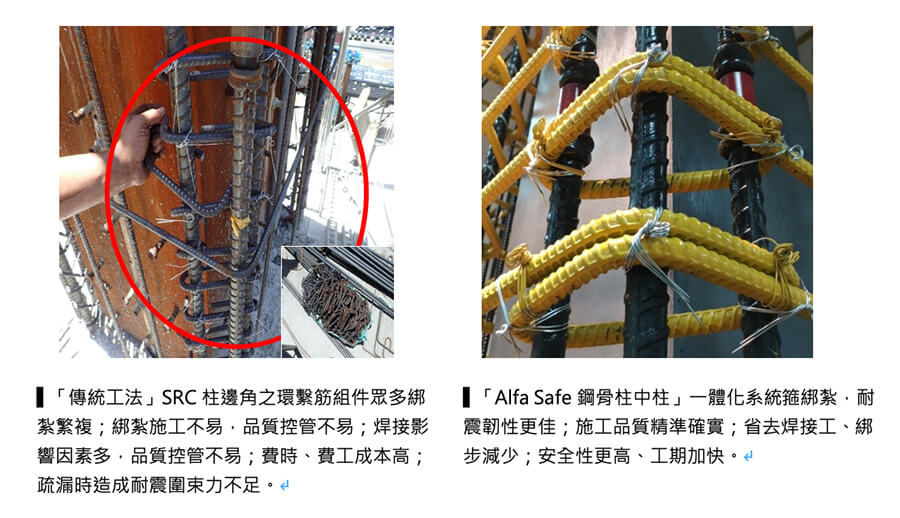 「Alfa Safe SRC柱中柱」優化傳統SRC鋼筋施工綁紮不易且焊接不易的缺點,一體成型模組化施工免焊接,每一處鋼筋環環相扣,提升結構耐震力。