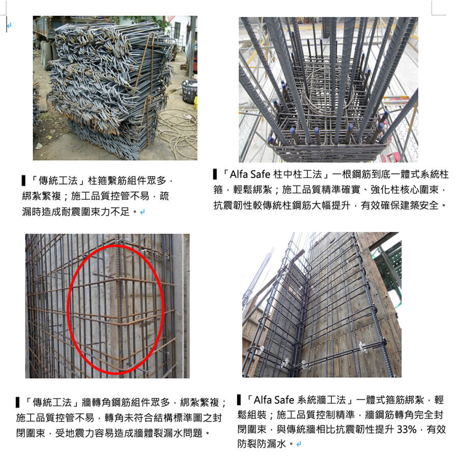 一、「傳統鋼筋工法」鋼筋一根一根剪斷綁紮,受實際眾多因素影響施工品質;「Alfa Safe耐震系統工法」由一體成形鋼筋彎折,尺寸經過嚴密規劃、品質如一,降低工地施工可能出現不良的缺失。