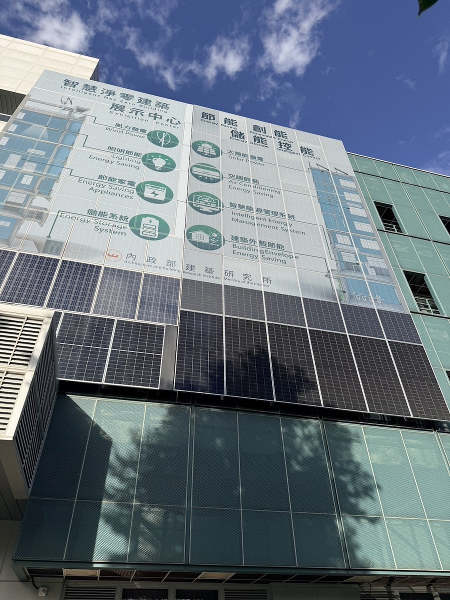 內政部建築研究所材料實驗中心公有既有建築示範場域,透過建築立面導入彩繪太陽光電、儲能與智慧能源管理系統,實證既有建築在不影響結構安全與使用機能前提下,具備轉型為淨零建築之可行工程路徑。